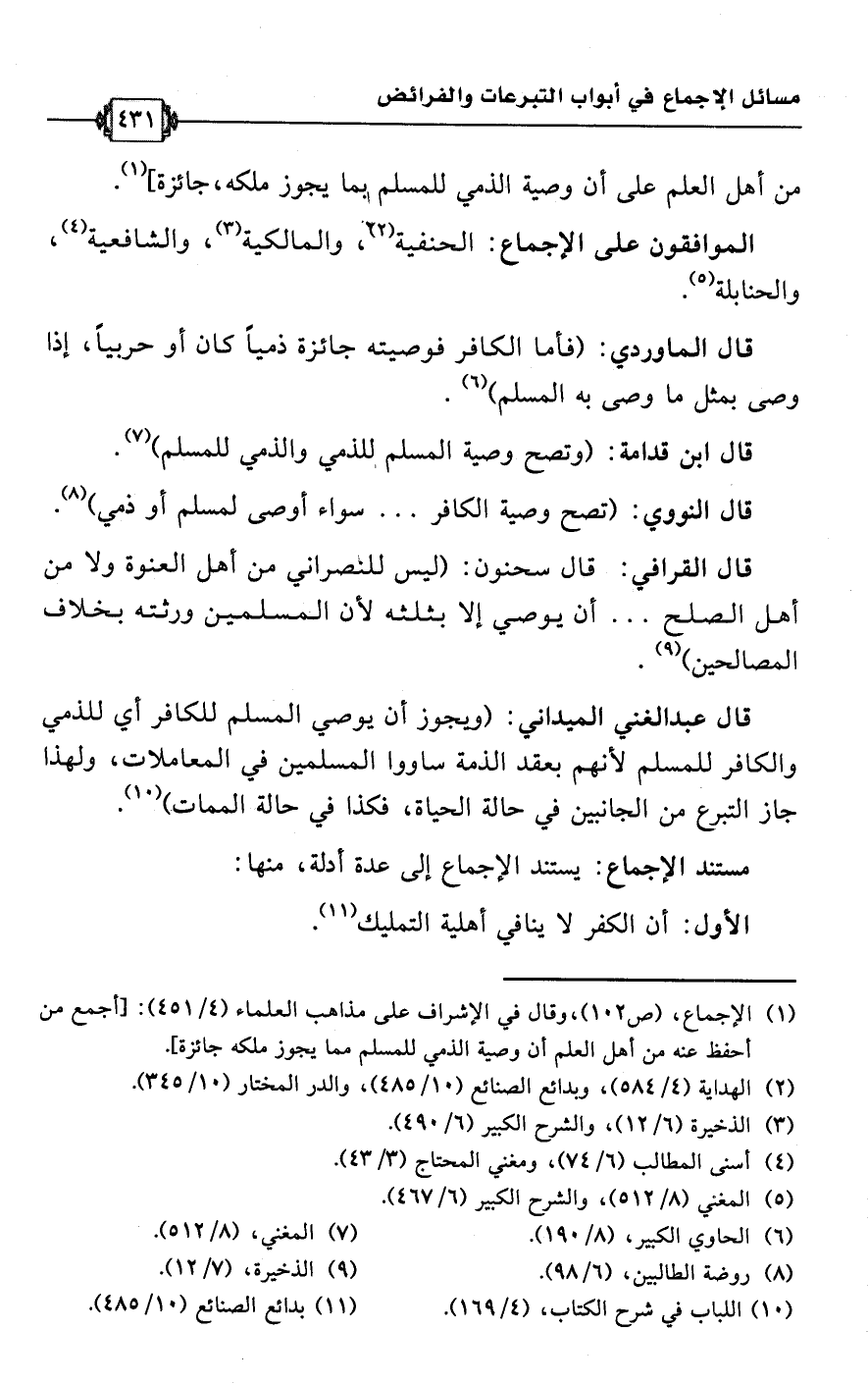 (¬1) الإجماع، (ص 102)، وقال في الإشراف على مذاهب العلماء (4/ 451): [أجمع من أحفظ عنه من أهل العلم أن وصية الذمي للمسلم مما يجوز ملكه جائزة].