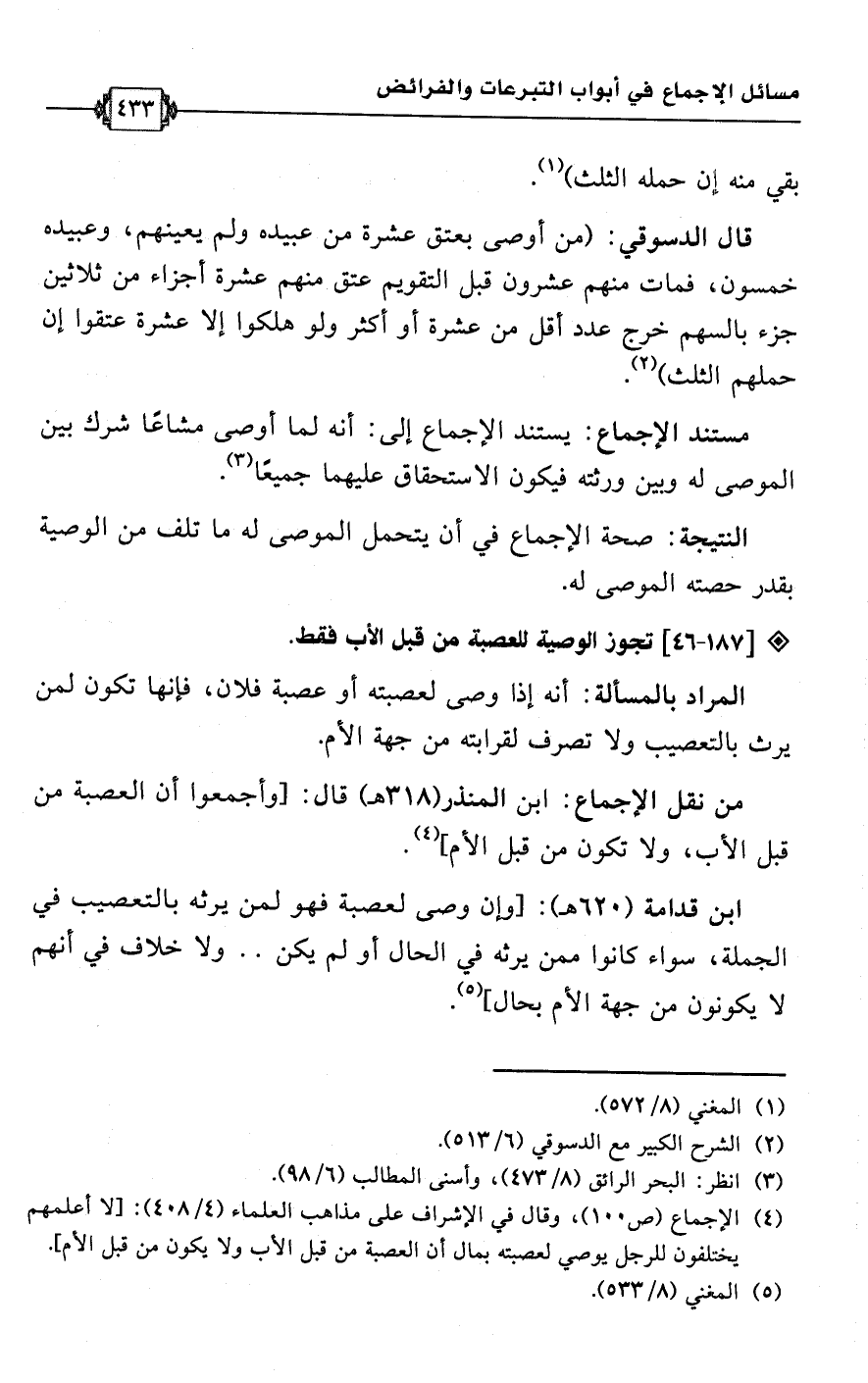 (¬4) الإجماع (ص 100)، وقال في الإشراف على مذاهب العلماء (4/ 408): [لا أعلمهم يختلفون للرجل يوصي لعصبته بمال أن العصبة من قبل الأب ولا يكون من قبل الأم].