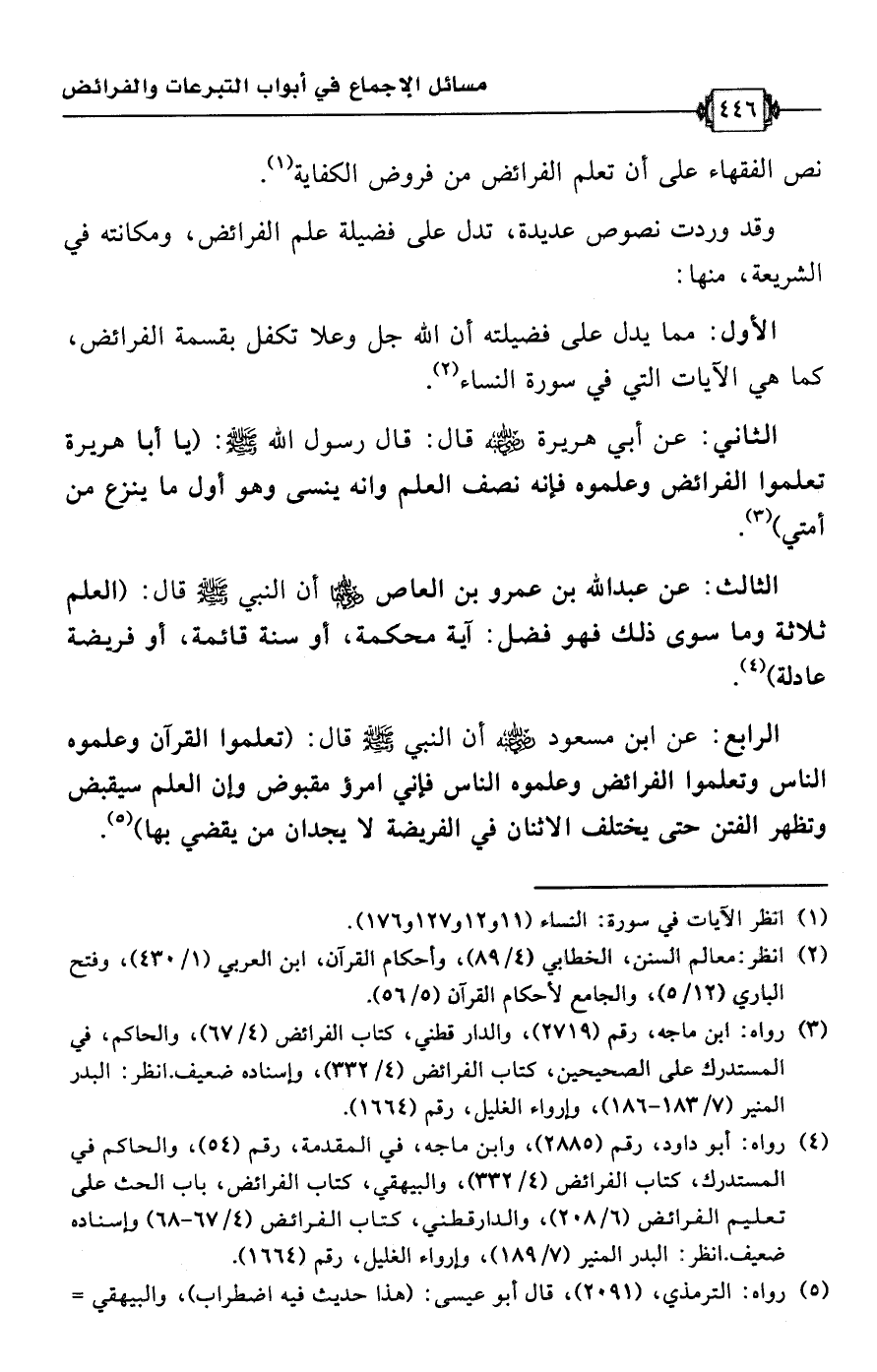 (¬4) رواه: أبو داود، رقم (2885)، وابن ماجه، في المقدمة، رقم (54)، والحاكم في المستدرك، كتاب الفرائض (4/ 332)، والبيهقي، كتاب الفرائض، باب الحث على تعليم الفرائض (6/ 208)، والدارقطني، كتاب الفرائض (4/ 67 - 68) وإسناده ضعيف. انظر: البدر المنير (7/ 189)، وإرواء الغليل، رقم (1664).