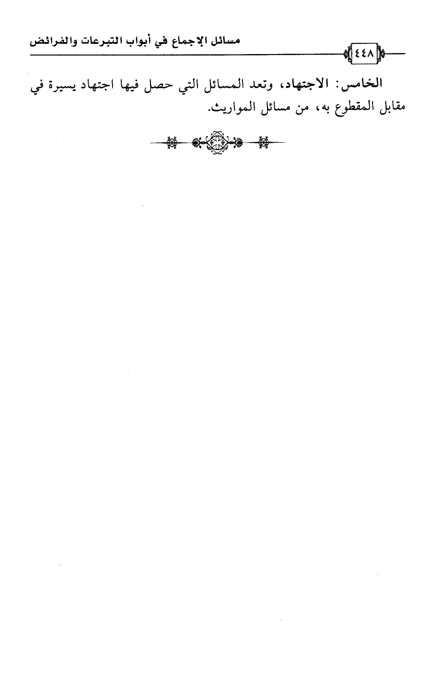 الخامس: الاجتهاد، وتعد المسائل التي حصل فيها اجتهاد يسيرة في مقابل المقطوع به، من مسائل المواريث.