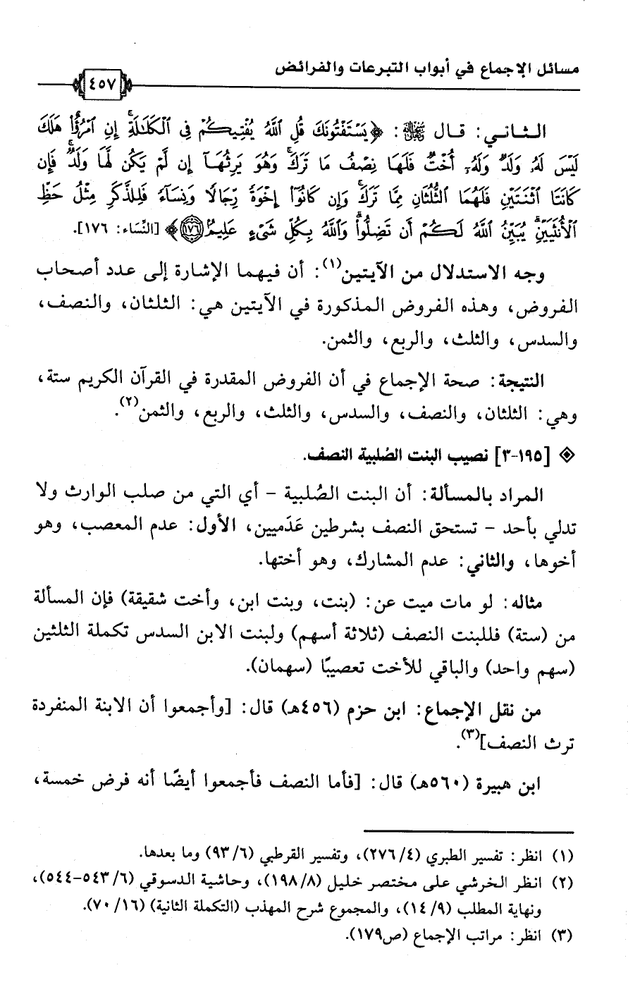 • من نقل الإجماع: ابن حزم (456 هـ) قال: [وأجمعوا أن الابنة المنفردة ترث النصف] (¬3).