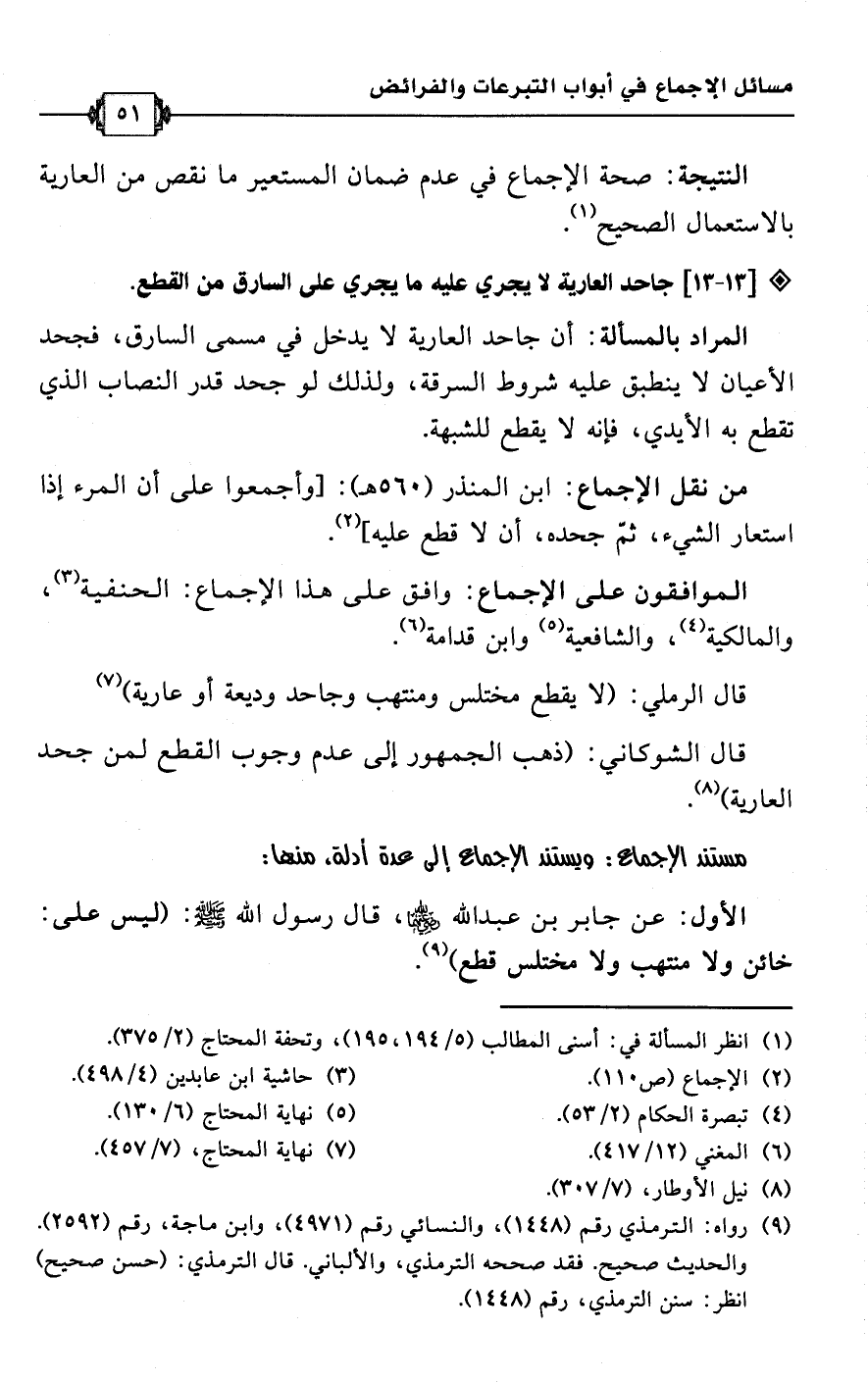 • من نقل الإجماع: ابن المنذر (560 هـ): [وأجمعوا على أن المرء إذا استعار الشيء، ثمّ جحده، أن لا قطع عليه] (¬2).