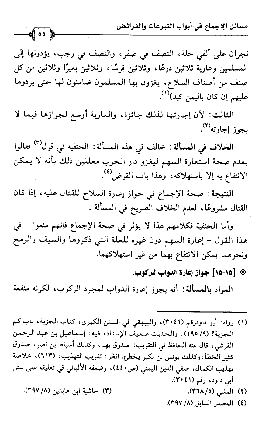 • الخلاف في المسألة: خالف في هذه المسألة: الحنفية في قول (¬3) فقالوا بعدم صحة استعارة السهم ليغزو دار الحرب معللين ذلك بأنه لا يمكن الانتفاع به إلا باستهلاكه، وهذا باب القرض (¬4).Rصحة الإجماع في جواز إعارة السلاح للقتال عليه، إذا كان القتال مشروعًا، لعدم الخلاف الصريح في المسألة.