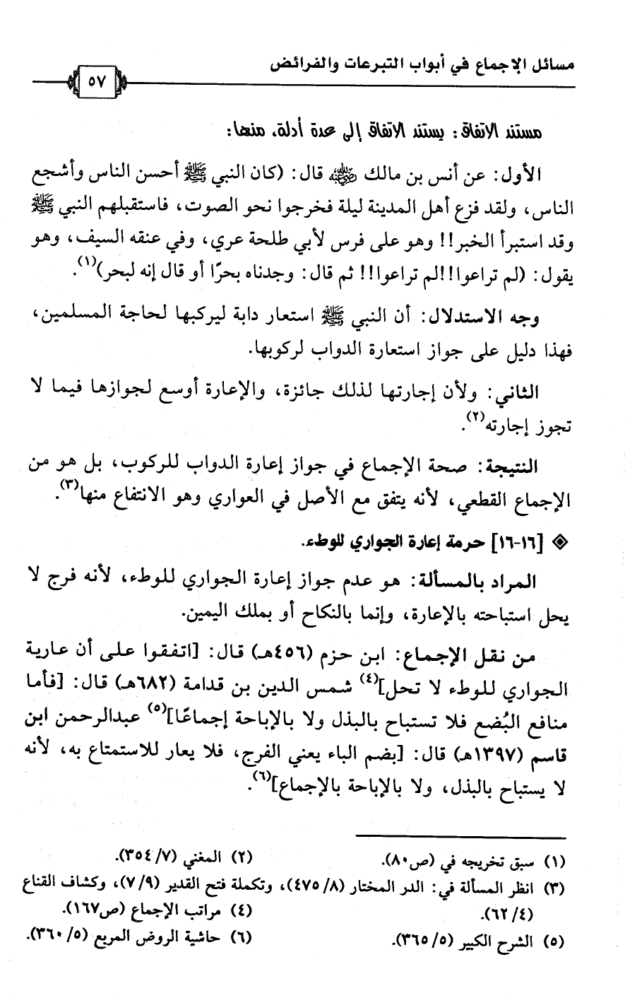 • من نقل الإجماع: ابن حزم (456 هـ) قال: [اتفقوا على أن عارية الجواري للوطء لا تحل] (¬4) شمس الدين بن قدامة (682 هـ) قال: [فأما منافع البُضع فلا تستباح بالبذل ولا بالإباحة إجماعًا] (¬5) عبد الرحمن ابن قاسم (1397 هـ) قال: [بضم الباء يعني الفرج، فلا يعار للاستمتاع به، لأنه لا يستباح بالبذل، ولا بالإباحة بالإجماع] (¬6).