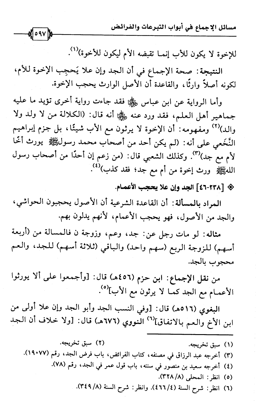 • من نقل الإجماع: ابن حزم (456 هـ) قال: [وأجمعوا على ألا يورثوا الأعمام مع الجد كما لا يرثون مع الأب] (¬5).