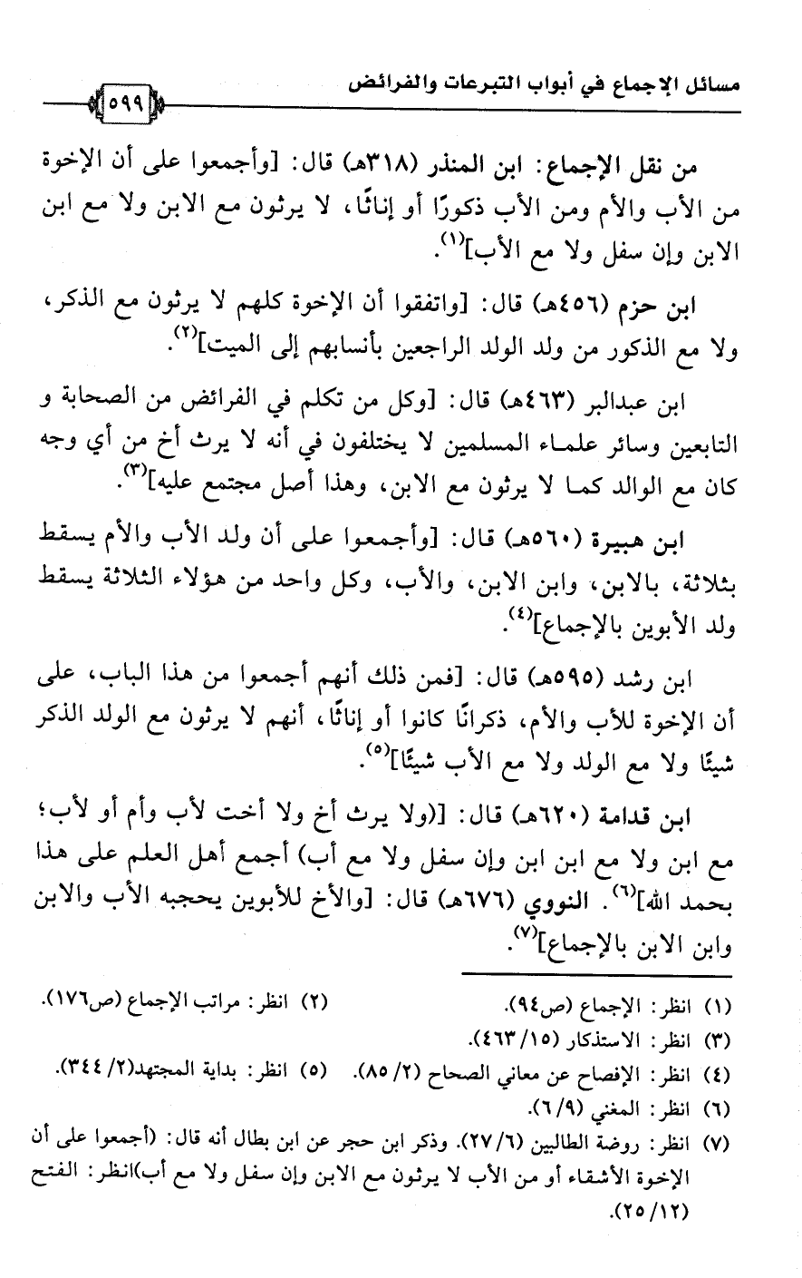 ابن قدامة (620 هـ) قال: [(ولا يرث أخ ولا أخت لأب وأم أو لأب؛ مع ابن ولا مع ابن ابن وإن سفل ولا مع أب) أجمع أهل العلم على هذا بحمد اللَّه] (¬6). النووي (676 هـ) قال: [والأخ للأبوين يحجبه الأب والابن وابن الابن بالإجماع] (¬7).