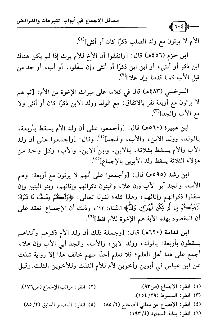 ابن هبيرة (560 هـ) قال: [وأجمعوا على أن ولد الأم يسقط بأربعة، بالولد، وولد الابن، والأب، والجد] (¬4). وقال: [وأجمعوا على أن ولد الأب والأم يسقط بثلاثة، بالابن، وابن الابن، والأب، وكل واحد من هؤلاء الثلاثة يسقط ولد الأبوين بالإجماع] (¬5).