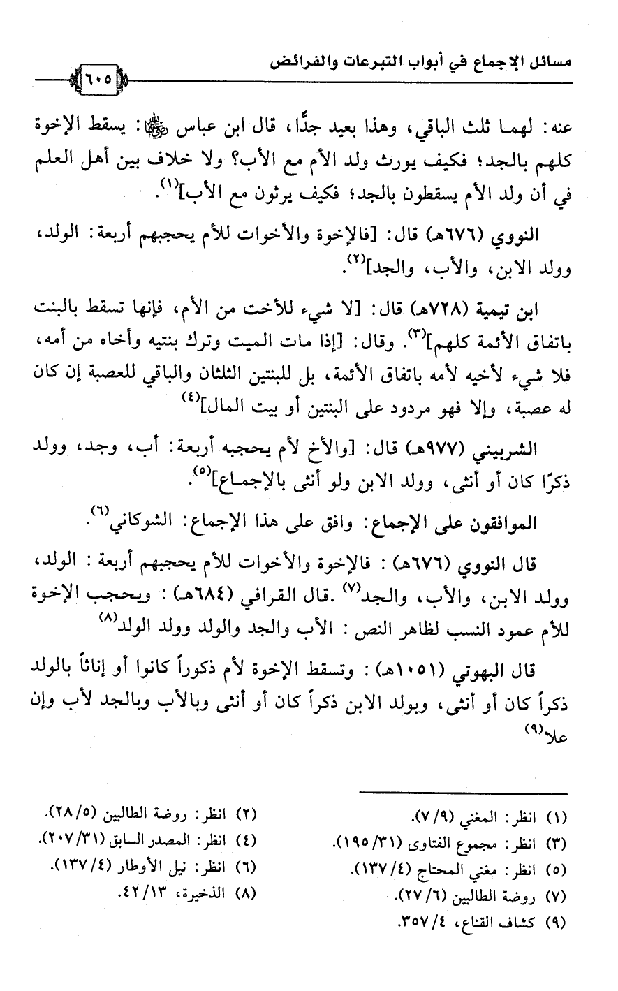 النووي (676 هـ) قال: [فالإخوة والأخوات للأم يحجبهم أربعة: الولد، وولد الابن، والأب، والجد] (¬2).