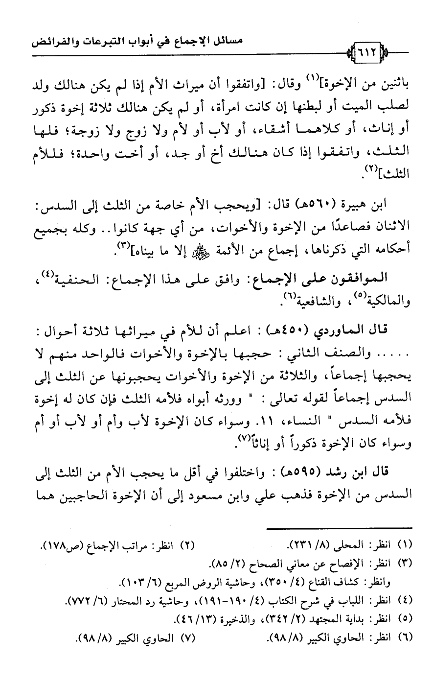 ابن هبيرة (560 هـ) قال: [ويحجب الأم خاصة من الثلث إلى السدس: الاثنان فصاعدًا من الإخوة والأخوات، من أي جهة كانوا. . وكله بجميع أحكامه التي ذكرناها، إجماع من الأئمة -رضي اللَّه عنهم- إلا ما بيناه] (¬3).