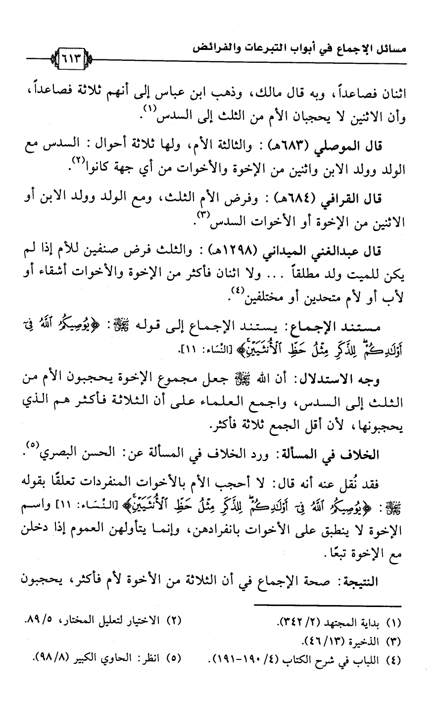 قال عبد الغني الميداني (1298 هـ): والثلث فرض صنفين للأم إذا لم يكن للميت ولد مطلقًا. . . ولا اثنان فأكثر من الإخوة والأخوات أشقاء أو لأب أو لأم متحدين أو مختلفين (¬4).