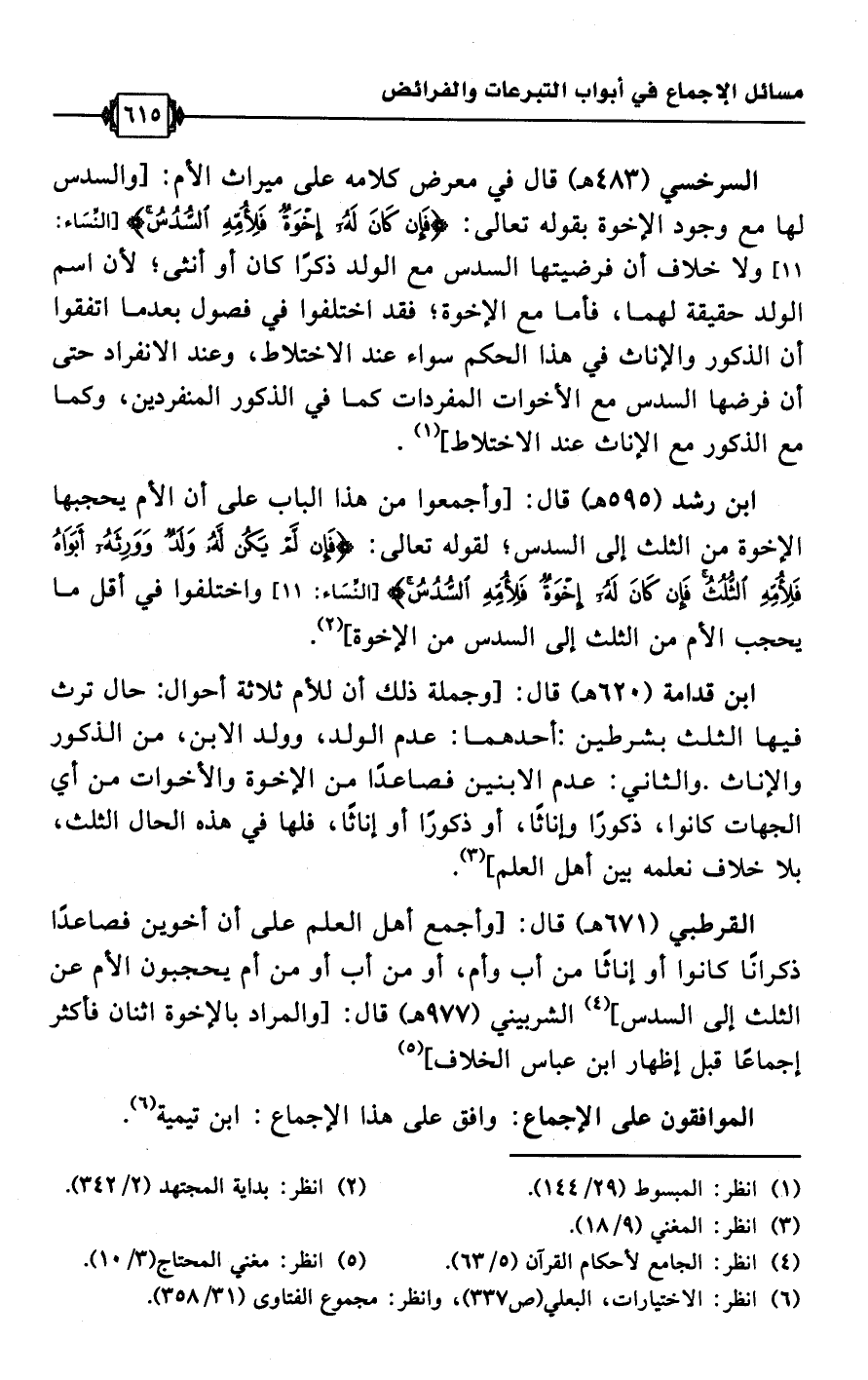 ابن رشد (595 هـ) قال: [وأجمعوا من هذا الباب على أن الأم يحجبها الإخوة من الثلث إلى السدس؛ لقوله تعالى: {فَإِنْ لَمْ يَكُنْ لَهُ وَلَدٌ وَوَرِثَهُ أَبَوَاهُ فَلِأُمِّهِ الثُّلُثُ فَإِنْ كَانَ لَهُ إِخْوَةٌ فَلِأُمِّهِ السُّدُسُ} [النساء: 11] واختلفوا في أقل ما يحجب الأم من الثلث إلى السدس من الأخوة] (¬2).