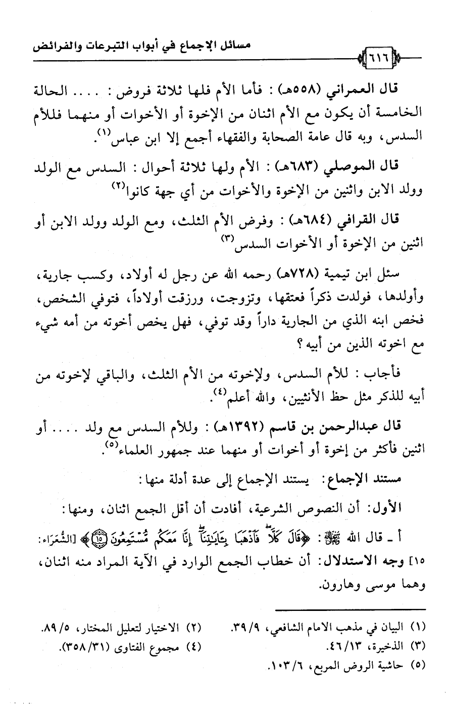 قال العمراني (558 هـ): فأما الأم فلها ثلاثة فروض: . . . . الحالة الخامسة أن يكون مع الأم اثنان من الإخوة أو الأخوات أو منهما فللأم السدس، وبه قال عامة الصحابة والفقهاء أجمع إلا ابن عباس (¬1).