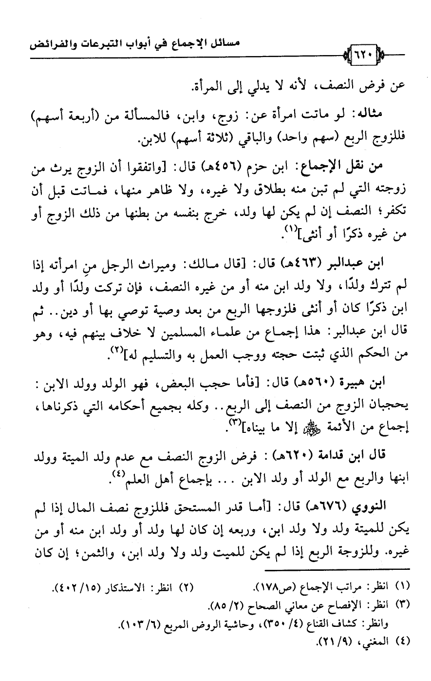 ابن عبد البر (463 هـ) قال: [قال مالك: وميراث الرجل من امرأته إذا لم تترك ولدًا، ولا ولد ابن منه أو من غيره النصف، فإن تركت ولدًا أو ولد ابن ذكرًا كان أو أنثى فلزوجها الربع من بعد وصية توصي بها أو دين. . ثم قال ابن عبد البر: هذا إجماع من علماء المسلمين لا خلاف بينهم فيه، وهو من الحكم الذي ثبتت حجته ووجب العمل به والتسليم له] (¬2).