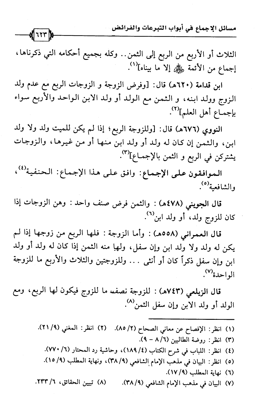 ابن قدامة (620 هـ) قال: [وفرض الزوجة والزوجات الربع مع عدم ولد الزوج وولد ابنه، والثمن مع الولد أو ولد الابن الواحد والأربع سواء بإجماع أهل العلم] (¬2).