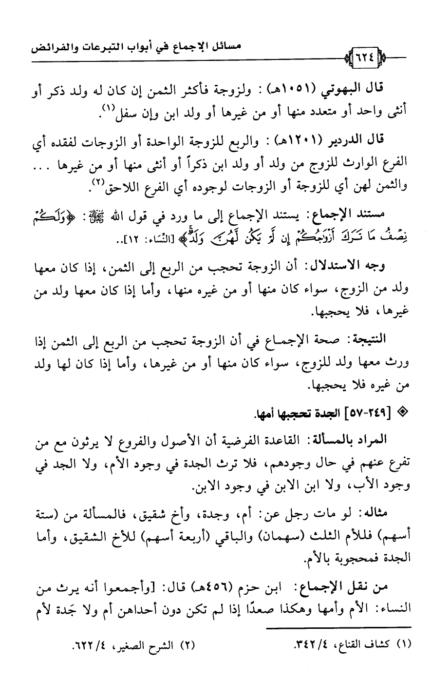 • وجه الاستدلال: أن الزوجة تحجب من الربع إلى الثمن، إذا كان معها ولد من الزوج، سواء كان منها أو من غيره منها، وأما إذا كان معها ولد من غيرها، فلا يحجبها.Rصحة الإجماع في أن الزوجة تحجب من الربع إلى الثمن إذا ورث معها ولد للزوج، سواء كان منها أو من غيرها، وأما إذا كان لها ولد من غيره فلا يحجبها.