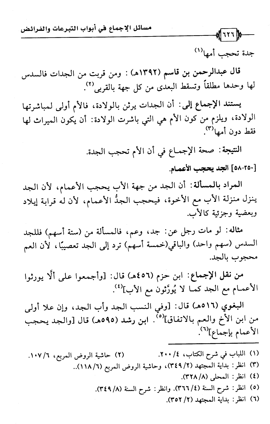 • من نقل الإجماع: ابن حزم (456 هـ) قال: [وأجمعوا على ألَّا يورثوا الأعمام مع الجد كما لا يُورَّثون مع الأب] (¬4).