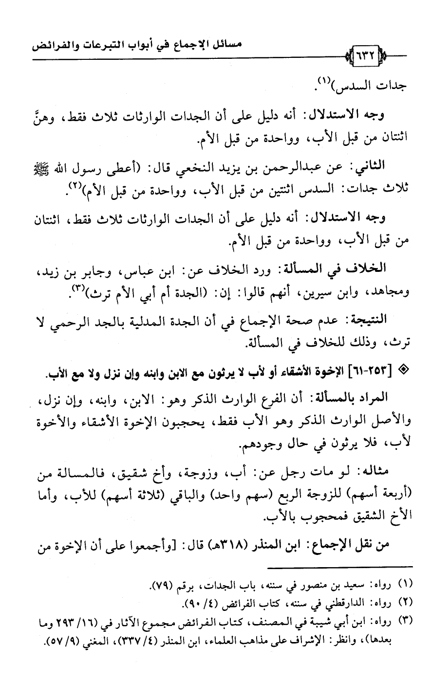 (¬3) رواه: ابن أبي شيبة في المصنف، كتاب الفرائض مجموع الآثار في (16/ 293 وما بعدها)، وانظر: الإشراف على مذاهب العلماء، ابن المنذر (4/ 337)، المغني (9/ 57).