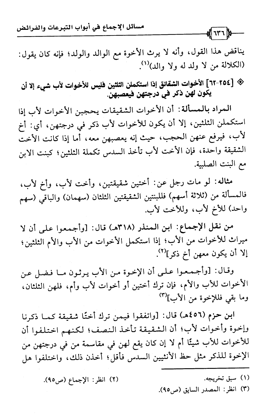 • من نقل الإجماع: ابن المنذر (318 هـ) قال: [وأجمعوا على أن لا ميراث للأخوات من الأب؛ إذا استكمل الأخوات من الأب والأم الثلثين؛ إلا أن يكون معهن أخ ذكر] (¬2).