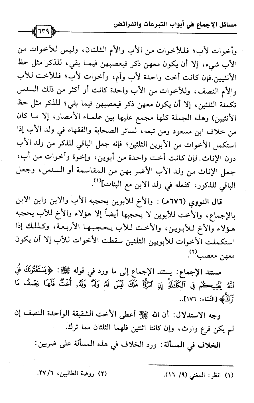 قال النووي (676 هـ): والأخ للأبوين يحجبه الأب والابن وابن الابن بالإجماع، والأخت للأبوين لا يحجبها أيضًا إلا هؤلاء والأخ للأب يحجبه هؤلاء والأخ للأبوين، والأخت للأب يحجبها الأربعة، وكذلك إذا استكملت الأخوات للأبويين الثلثين سقطت الأخوات للأب إلا أن يكون معهن معصب (¬2).