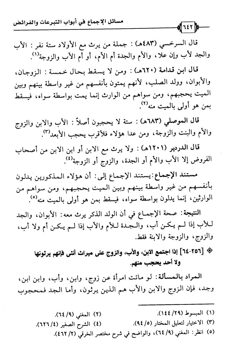 قال ابن قدامة (620 هـ): ومن لا يسقط بحال خمسة: الزوجان، والأبوان، وولد الصلب، لأنهم يمتون بأنفسهم من غير واسطة بينهم وبين الميت ججبهم، ومن سواهم من الوارث إنما يمت بواسطة سواه، فيسقط بمن هو أولى بالميت منه (¬2).