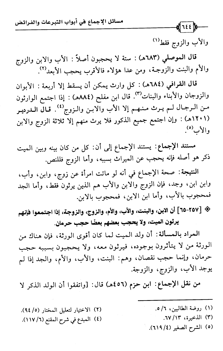 • مستند الإجماع: يستند الإجماع إلى أن: كل من كان بينه وبين الميت ذكر هو أصله فإنه يحجب عن الميراث بسببه، وأما الزوج فللنص.Rصحة الإجماع في أنه لو ماتت امرأة عن زوج، وابن، وأب، وابن ابن، وجد، فإن الزوج والابن والأب هم الذين يرثون فقط، وأما الجد فمحجوب بالأب، وأما ابن الابن، فمحجوب بالابن.
