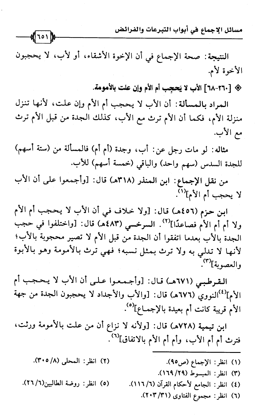 القرطبي (671 هـ) قال: [وأجمعوا على أن الأب لا يحجب أم الأم] (¬4) النووي (676 هـ) قال: [والأب والأجداد لا يحجبون الجدة من جهة الأم قريبة كانت أم بعيدة بالإجماع] (¬5).