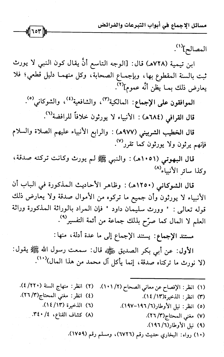 قال البهوتي (1051 هـ): والنبي -صلى اللَّه عليه وسلم- لم يورث وكانت تركته صدقة، وكذا سائر الأنبياء (¬8).
