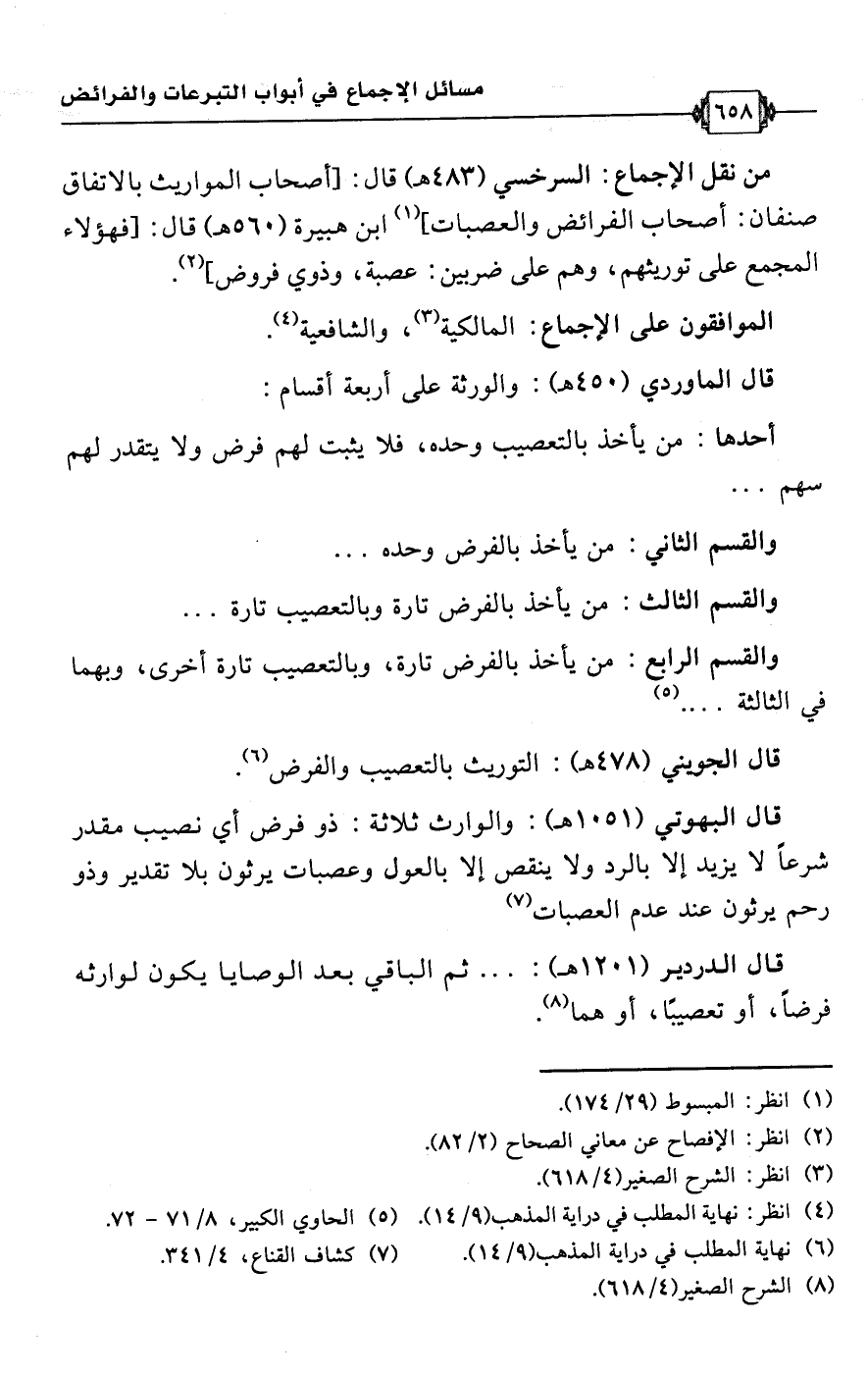 • من نقل الإجماع: السرخسي (483 هـ) قال: [أصحاب المواريث بالاتفاق صنفان: أصحاب الفرائض والعصبات] (¬1) ابن هبيرة (560 هـ) قال: [فهؤلاء المجمع على توريثهم، وهم على ضربين: عصبة، وذوي فروض] (¬2).