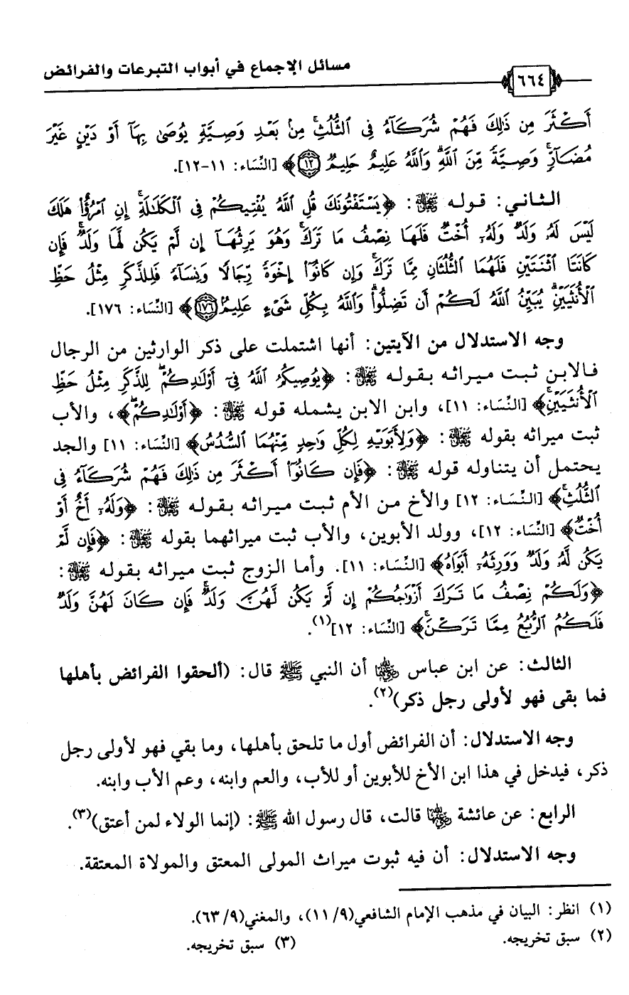 • وجه الاستدلال من الآيتين: أنها اشتملت على ذكر الوارثين من الرجال فالابن ثبت ميراثه بقوله سبحانه وتعالى: {يُوصِيكُمُ اللَّهُ فِي أَوْلَادِكُمْ لِلذَّكَرِ مِثْلُ حَظِّ الْأُنْثَيَيْنِ} [النساء: 11]، وابن الابن يشمله قوله سبحانه وتعالى: {أَوْلَادِكُمْ}، والأب ثبت ميراثه بقوله سبحانه وتعالى: {وَلِأَبَوَيْهِ لِكُلِّ وَاحِدٍ مِنْهُمَا السُّدُسُ} [النساء: 11] والجد يحتمل أن يتناوله قوله سبحانه وتعالى: {فَإِنْ كَانُوا أَكْثَرَ مِنْ ذَلِكَ فَهُمْ شُرَكَاءُ فِي الثُّلُثِ} [النساء: 12] والأخ من الأم ثبت ميراثه بقوله سبحانه وتعالى: {وَلَهُ أَخٌ أَوْ أُخْتٌ} [النساء: 12]، وولد الأبوين، والأب ثبت ميراثهما بقوله سبحانه وتعالى: {فَإِنْ لَمْ يَكُنْ لَهُ وَلَدٌ وَوَرِثَهُ أَبَوَاهُ} [النساء: 11]. وأما الزوج ثبت ميراثه بقوله سبحانه وتعالى: {وَلَكُمْ نِصْفُ مَا تَرَكَ أَزْوَاجُكُمْ إِنْ لَمْ يَكُنْ لَهُنَّ وَلَدٌ فَإِنْ كَانَ لَهُنَّ وَلَدٌ فَلَكُمُ الرُّبُعُ مِمَّا تَرَكْنَ} [النساء: 12] (¬1).