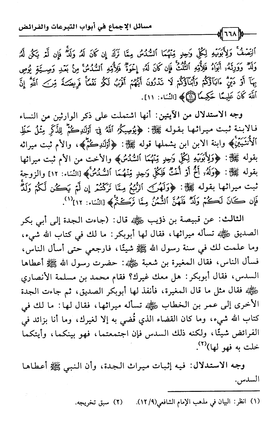 • وجه الاستدلال من الآيتين: أنها اشتملت على ذكر الوارثين من النساء فالابنة ثبت ميراثها بقوله سبحانه وتعالى: {يُوصِيكُمُ اللَّهُ فِي أَوْلَادِكُمْ لِلذَّكَرِ مِثْلُ حَظِّ الْأُنْثَيَيْنِ} وابنة الابن ابن يشملها قوله سبحانه وتعالى: {أَوْلَادِكُمْ}، والأم ثبت ميراثه بقوله سبحانه وتعالى: {وَلِأَبَوَيْهِ لِكُلِّ وَاحِدٍ مِنْهُمَا السُّدُسُ} والأخت من الأم ثبت ميراثها بقوله سبحانه وتعالى: {وَلَهُ أَخٌ أَوْ أُخْتٌ فَلِكُلِّ وَاحِدٍ مِنْهُمَا السُّدُسُ} [النساء: 12] والزوجة ثبت ميراثها بقوله سبحانه وتعالى: {وَلَهُنَّ الرُّبُعُ مِمَّا تَرَكْتُمْ إِنْ لَمْ يَكُنْ لَكُمْ وَلَدٌ فَإِنْ كَانَ لَكُمْ وَلَدٌ فَلَهُنَّ الثُّمُنُ مِمَّا تَرَكْتُمْ} [النساء: 12] (¬1).