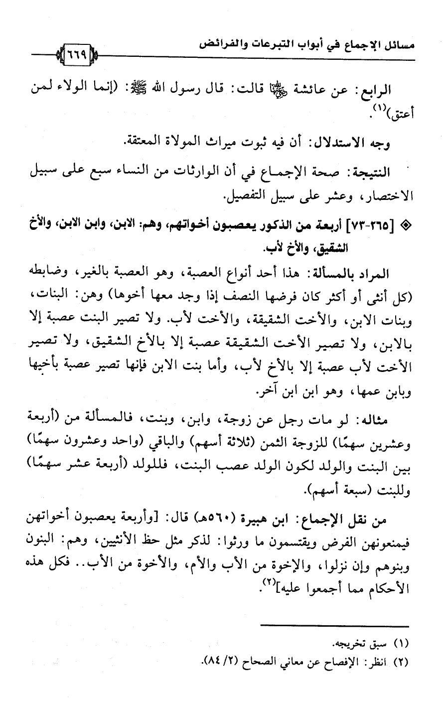 • من نقل الإجماع: ابن هبيرة (560 هـ) قال: [وأربعة يعصبون أخواتهن فيمنعونهن الفوض ويقتسمون ما ورثوا: لذكر مثل حظ الأنثيين، وهم: البنون وبنوهم وإن نزلوا، والإخوة من الأب والأم، والأخوة من الأب. . فكل هذه الأحكام مما أجمعوا عليه] (¬2).