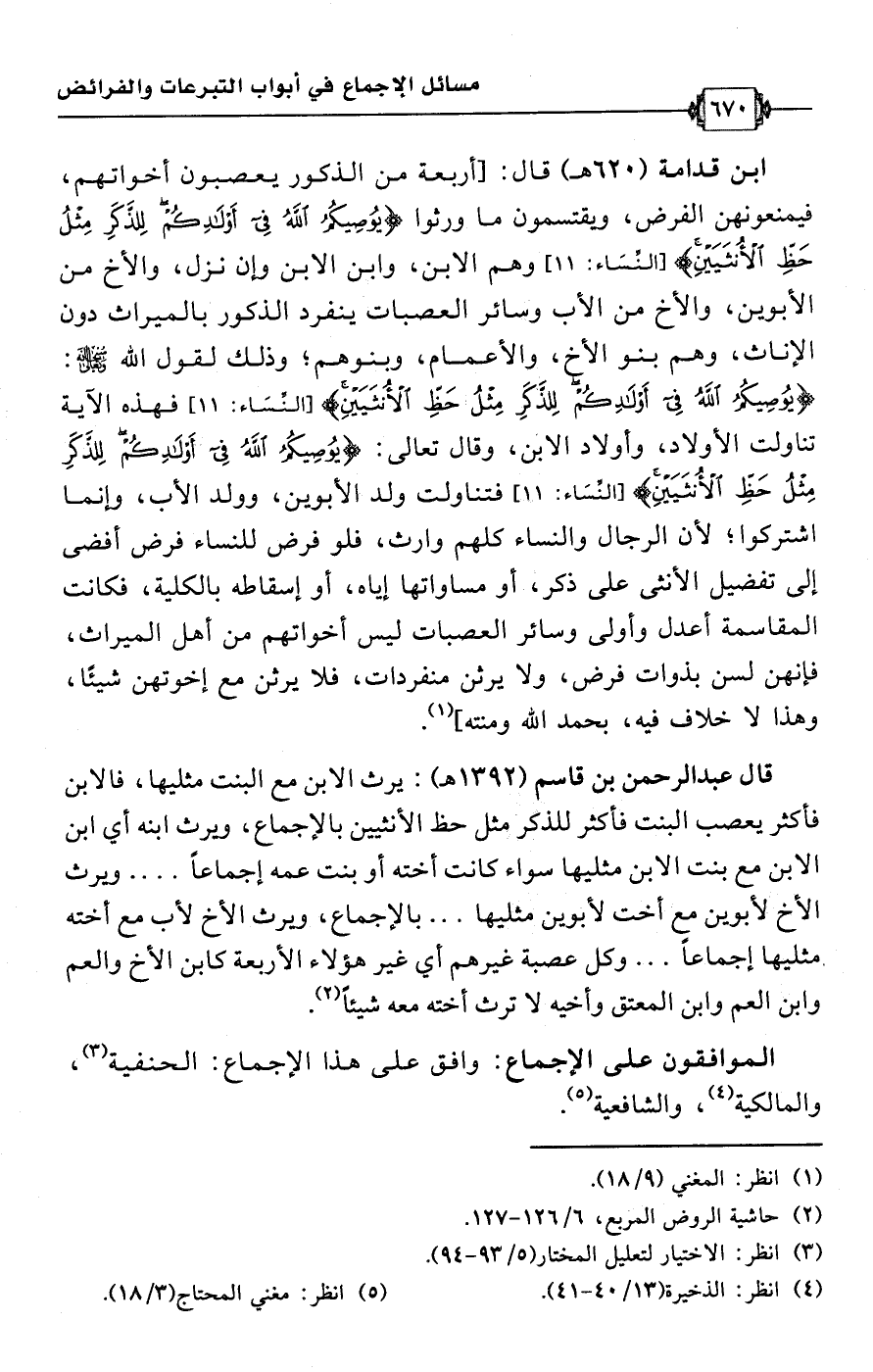 ابن قدامة (620 هـ) قال: [أربعة من الذكور يعصبون أخواتهم، فيمنعونهن الفرض، ويقتسمون ما ورثوا {يُوصِيكُمُ اللَّهُ فِي أَوْلَادِكُمْ لِلذَّكَرِ مِثْلُ حَظِّ الْأُنْثَيَيْنِ} [النساء: 11] وهم الابن، وابن الابن وإن نزل، والأخ من الأبوين، والأخ من الأب وسائر العصبات ينفرد الذكور بالميراث دون الإناث، وهم بنو الأخ، والأعمام، وبنوهم؛ وذلك لقول اللَّه سبحانه وتعالى: {يُوصِيكُمُ اللَّهُ فِي أَوْلَادِكُمْ لِلذَّكَرِ مِثْلُ حَظِّ الْأُنْثَيَيْنِ} [النساء: 11] فهذه الآية تناولت الأولاد، وأولاد الابن، وقال تعالى: {يُوصِيكُمُ اللَّهُ فِي أَوْلَادِكُمْ لِلذَّكَرِ مِثْلُ حَظِّ الْأُنْثَيَيْنِ} [النساء: 11] فتناولت ولد الأبوين، وولد الأب، وإنما اشتركوا؛ لأن الرجال والنساء كلهم وارث، فلو فرض للنساء فرض أفضى إلى تفضيل الأنثى على ذكر، أو مساواتها إياه، أو إسقاطه بالكلية، فكانت المقاسمة أعدل وأولى وسائر العصبات ليس أخواتهم من أهل الميراث، فإنهن لسن بذوات فرض، ولا يرثن منفردات، فلا يرثن مع إخوتهن شيئًا، وهذا لا خلاف فيه، بحمد اللَّه ومنته] (¬1).