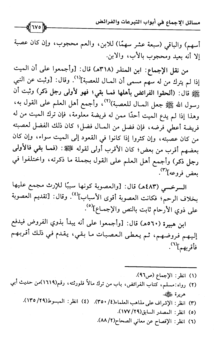 ابن هبيرة (560 هـ) قال: [وأجمعوا على أنه يبدأ بذوي الفروض فيدفع إليهم فروضهم، ثم يعطى العصبات ما بقي، يقدم في ذلك أقربهم فأقربهم] (¬6).