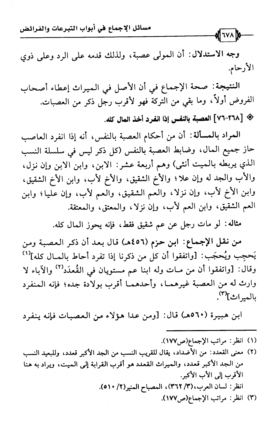 • من نقل الإجماع: ابن حزم (456 هـ) قال بعد أن ذكر العصبة ومن يَحجِب ويُحجَب: [واتفقوا أن كل من ذكرنا إذا تفرد أحاط بالمال كله] (¬1) وقال: [واتفقوا أن من مات وله ابنا عم مستويان في القُعدَد (¬2) والآباء لا وارث له من العصبة غيرهما، وأحدهما أقرب بولادة جده؛ فإنه المنفرد بالميراث] (¬3).