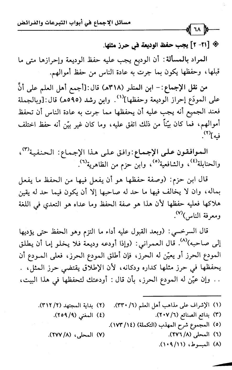 • من نقل الإجماع: ابن المنذر (318 هـ) قال: [أجمع أهل العلم على أن على المودَع إحراز الوديعة وحفظها] (¬1). وابن رشد (595 هـ) قال: [وبالجملة فعند الجميع أنه يجب عليه أن يحفظها مما جرت به عادة الناس أن تحفظ أمولهم، فما كان بيّنًا من ذلك اتفق عليه، وما كان غير بيّن أنه حفظ اختلف فيه] (¬2).