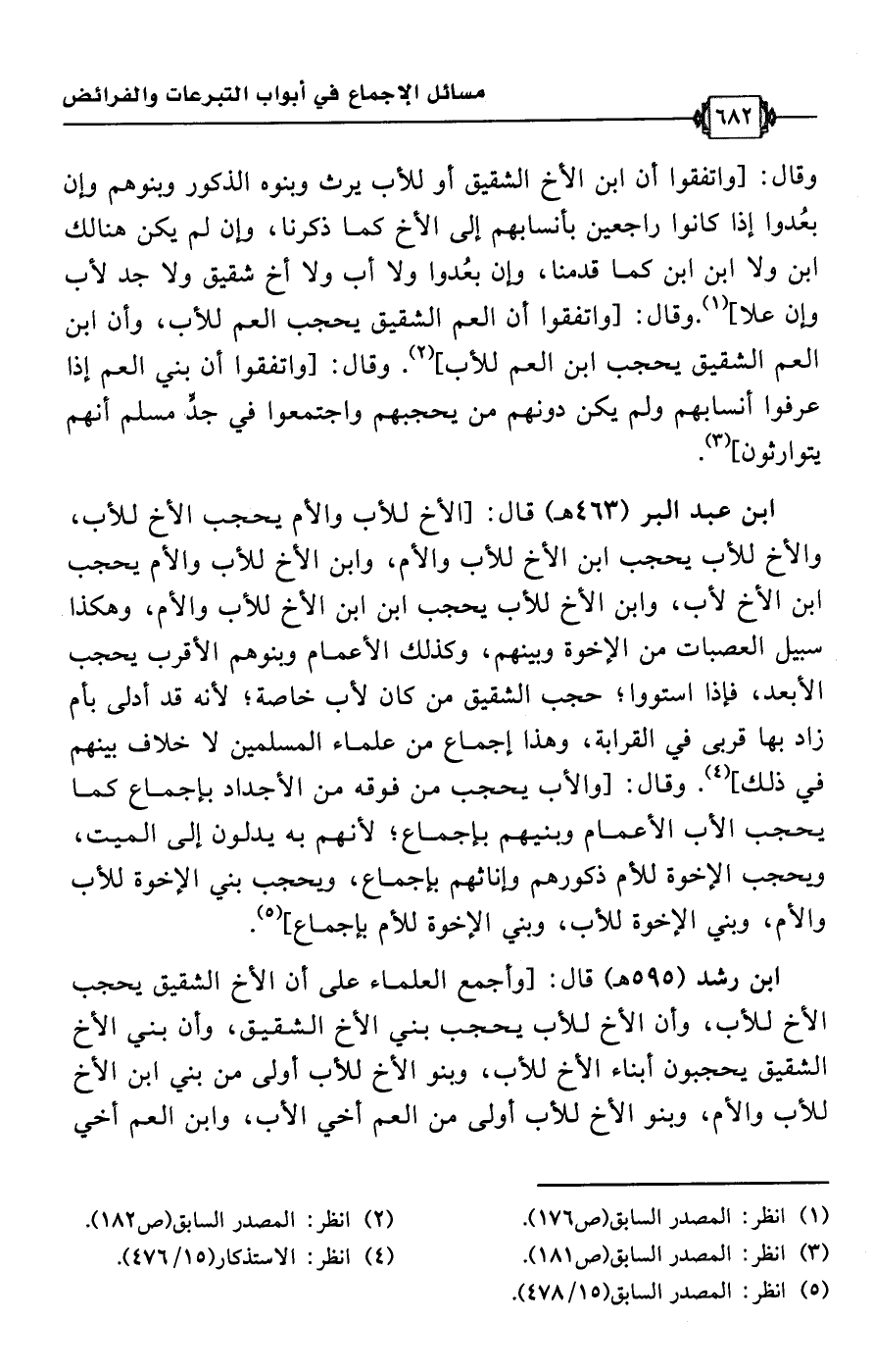 ابن عبد البر (463 هـ) قال: [الأخ للأب والأم يحجب الأخ للأب، والأخ للأب يحجب ابن الأخ للأب والأم، وابن الأخ للأب والأم يحجب ابن الأخ لأب، وابن الأخ للأب يحجب ابن ابن الأخ للأب والأم، وهكذا سبيل العصبات من الإخوة وبينهم، وكذلك الأعمام وبنوهم الأقرب يحجب الأبعد، فإذا استووا؛ حجب الشقيق من كان لأب خاصة؛ لأنه قد أدلى بأم زاد بها قربى في القرابة، وهذا إجماع من علماء المسلمين لا خلاف بينهم في ذلك] (¬4). وقال: [والأب حجب من فوقه من الأجداد بإجماع كما يحجب الأب الأعمام وبنيهم بإجماع؛ لأنهم به يدلون إلى الميت، ويحجب الإخوة للأم ذكورهم وإناثهم بإجماع، ويحجب بني الإخوة للأب والأم، وبني الإخوة للأب، وبني الإخوة للأم بإجماع] (¬5).