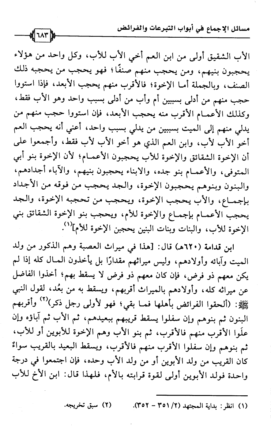 ابن قدامة (620 هـ) قال: [هذا في ميراث العصبة وهم الذكور من ولد الميت وآبائه وأولادهم، وليس ميراثهم مقدارًا بل يأخذون المال كله إذا لم يكن معهم ذو فرض، فإن كان معهم ذو فرض لا يسقط بهم؛ أخذوا الفاضل عن ميراثه كله، وأولادهم بالميراث أقربهم، ويسقط به من بعُد، لقول النبي -صلى اللَّه عليه وسلم-: (ألحقوا الفرائض بأهلها فما بقي؛ فهو لأولى رجل ذكر) (¬2) وأقربهم البنون ثم بنوهم وإن سفلوا يسقط قريبهم ببعيدهم، ثم الأب ثم آباؤه وإن علَوا الأقرب منهم فالأقرب، ثم بنو الأب وهم الإخوة للأبوين أو للأب، ثم بنوهم وإن سفلوا الأقرب منهم فالأقرب، ويسقط البعيد بالقريب سواءٌ كان القريب من ولد الأبوين أو من ولد الأب وحده، فإن اجتمعوا في درجة واحدة فولد الأبوين أولى لقوة قرابته بالأم، فلهذا قال: ابن الأخ للأب