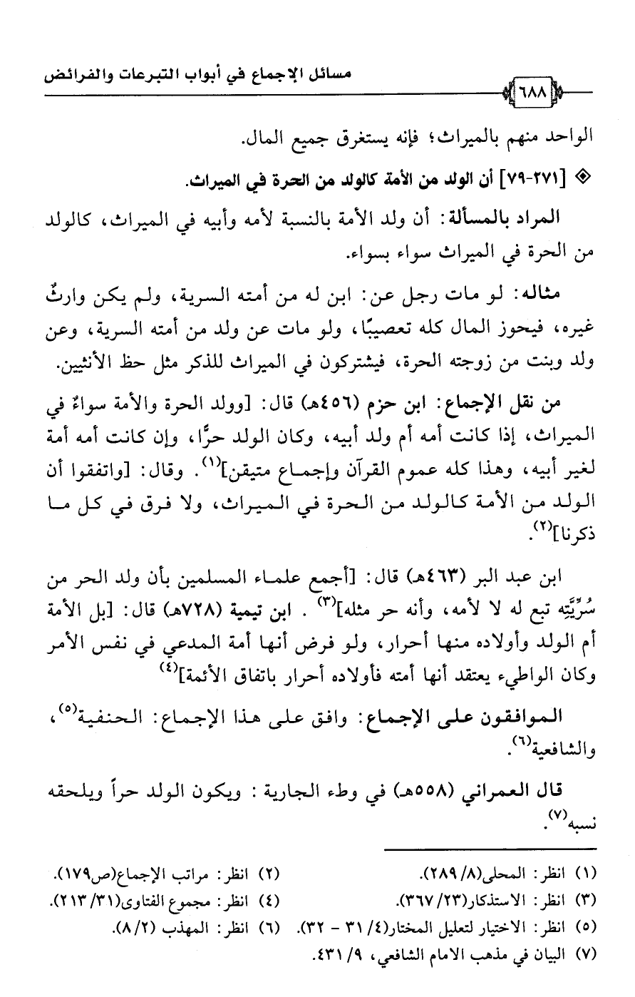 • من نقل الإجماع: ابن حزم (456 هـ) قال: [وولد الحرة والأمة سواءٌ في الميراث، إذا كانت أمه أم ولد أبيه، وكان الولد حرًّا، وإن كانت أمه أمة لغير أبيه، وهذا كله عموم القرآن وإجماع متيقن] (¬1). وقال: [واتفقوا أن الولد من الأمة كالولد من الحرة في الميراث، ولا فرق في كل ما ذكرنا] (¬2).