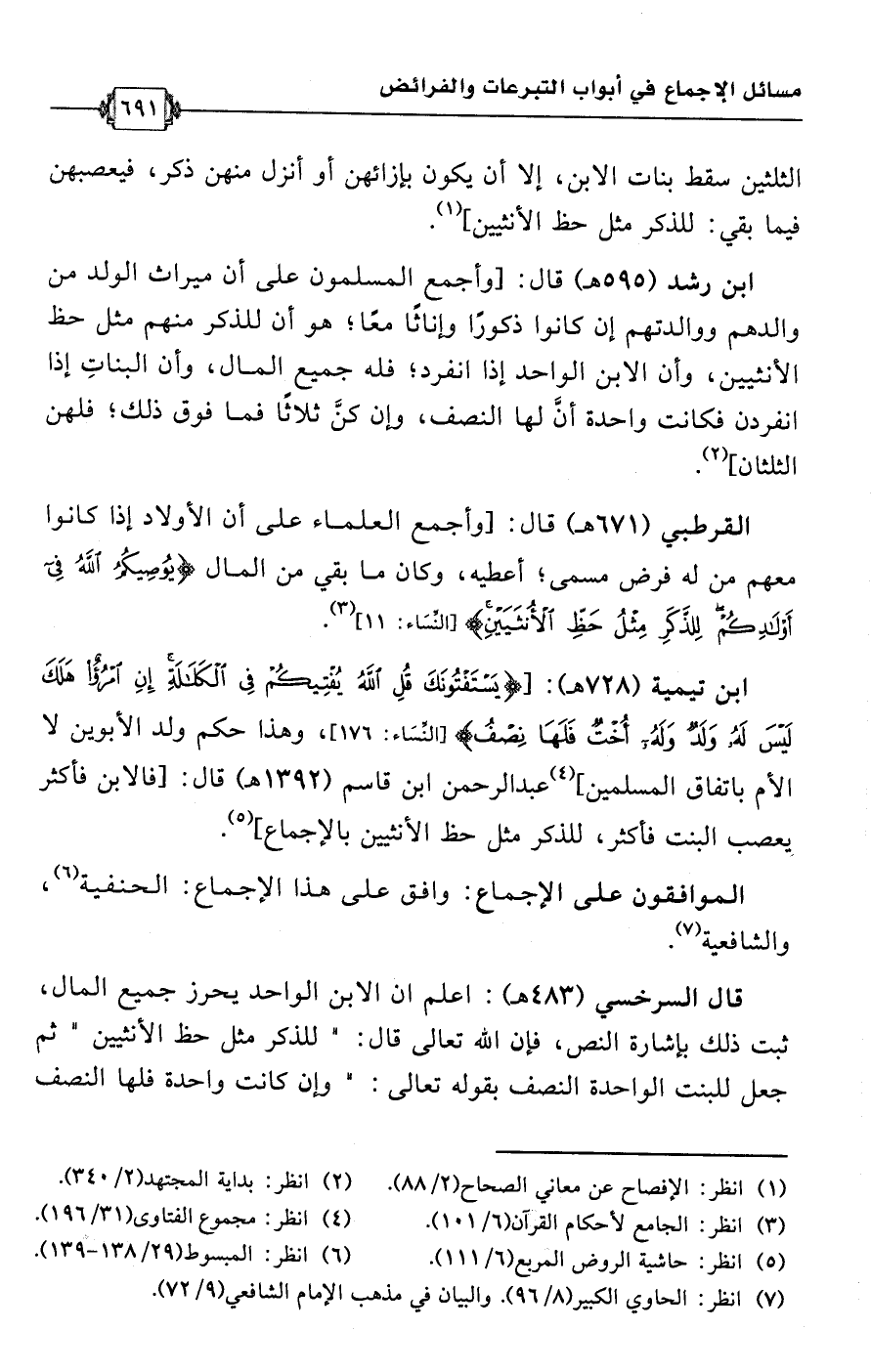 ابن رشد (595 هـ) قال: [وأجمع المسلمون على أن ميراث الولد من والدهم ووالدتهم إن كانوا ذكورًا وإناثَا معًا؛ هو أن للذكر منهم مثل حظ الأنثيين، وأن الابن الواحد إذا انفرد؛ فله جميع المال، وأن البناتِ إذا انفردن فكانت واحدة أن لها النصف، وإن كنَّ ثلاثًا فما فوق ذلك؛ فلهن الثلثان] (¬2).