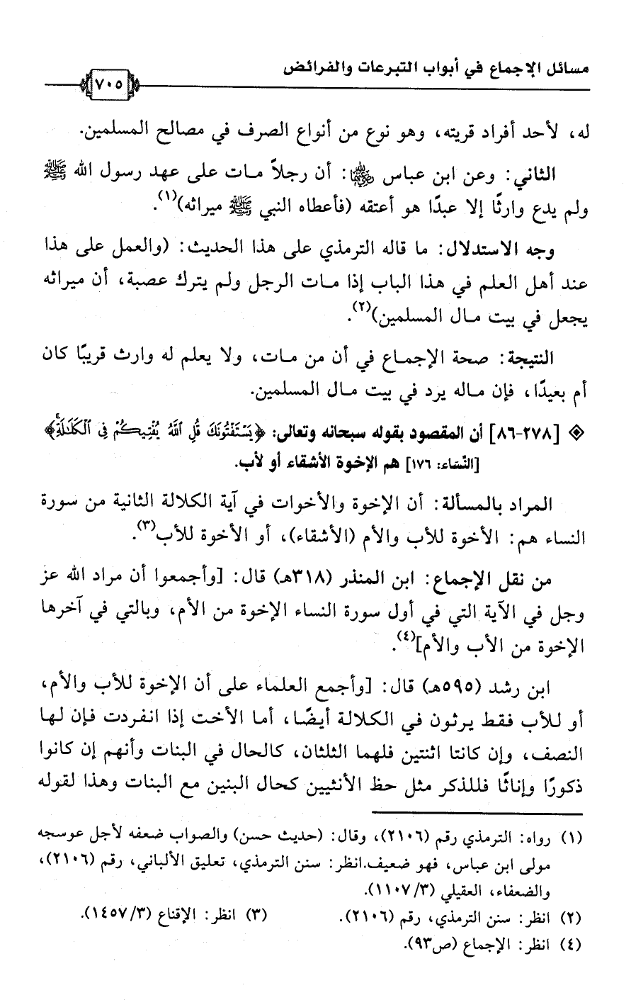 • وجه الاستدلال: ما قاله الترمذي على هذا الحديث: (والعمل على هذا عند أهل العلم في هذا الباب إذا مات الرجل ولم يترك عصبة، أن ميراثه يجعل في بيت مال المسلمين) (¬2).Rصحة الإجماع في أن من مات، ولا يعلم له وارث قريبًا كان أم بعيدًا، فإن ماله يرد في بيت مال المسلمين.