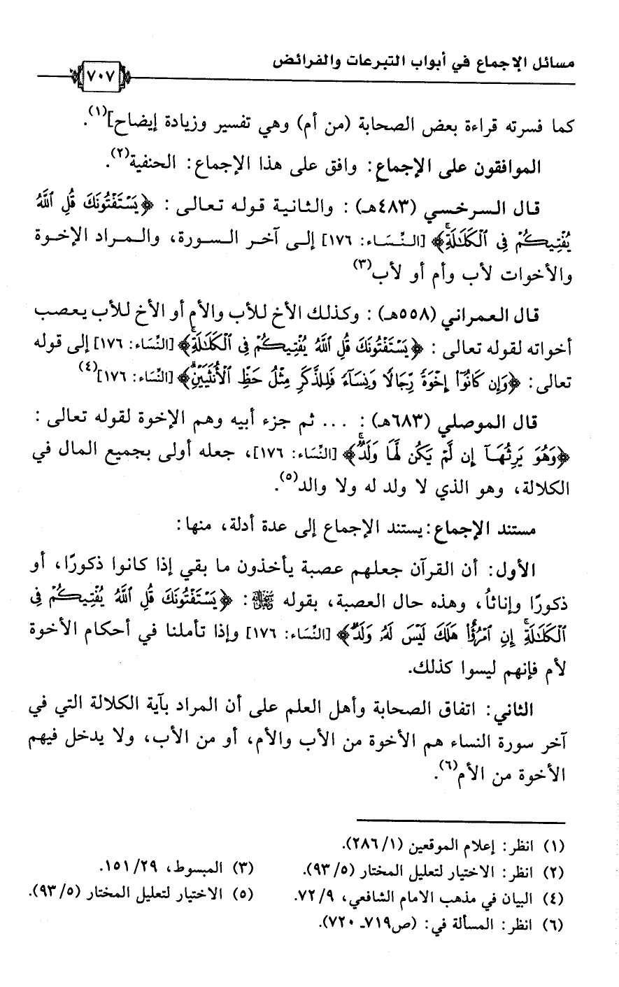 قال السرخسي (483 هـ): والثانية قوله تعالى: {يَسْتَفْتُونَكَ قُلِ اللَّهُ يُفْتِيكُمْ فِي الْكَلَالَةِ} [النساء: 176] إلى آخر السورة، والمراد الإخوة والأخوات لأب وأم أو لأب (¬3).
