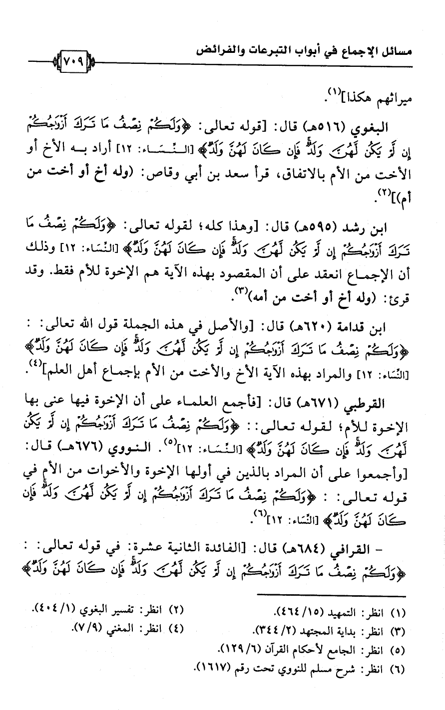 ابن قدامة (620 هـ) قال: [والأصل في هذه الجملة قول اللَّه تعالى: {وَلَكُمْ نِصْفُ مَا تَرَكَ أَزْوَاجُكُمْ إِنْ لَمْ يَكُنْ لَهُنَّ وَلَدٌ فَإِنْ كَانَ لَهُنَّ وَلَدٌ} [النساء: 12] والمراد بهذه الآية الأخ والأخت من الأم بإجماع أهل العلم] (¬4).