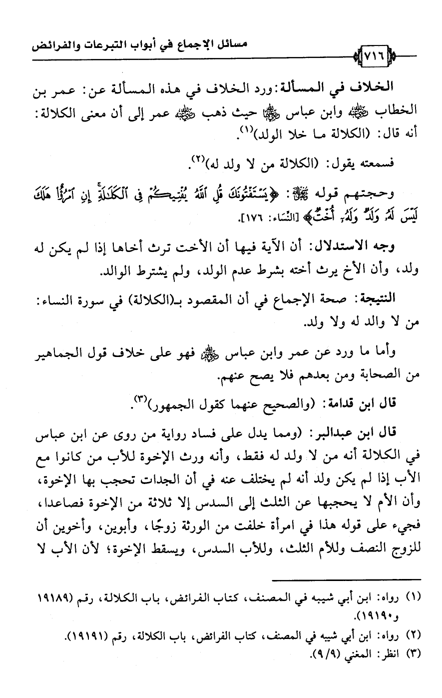 (¬1) رواه: ابن أبي شيبه في المصنف، كتاب الفرائض، باب الكلالة، رقم (19189 و 19190).