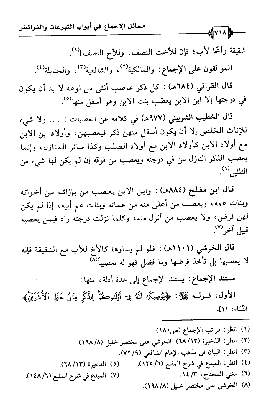 قال القرافي (684 هـ): كل ذكر عاصب أنثى من نوعه لا بد أن يكون في درجتها إلا ابن الابن يعصّب بنت الابن وهو أسفل منها (¬5).