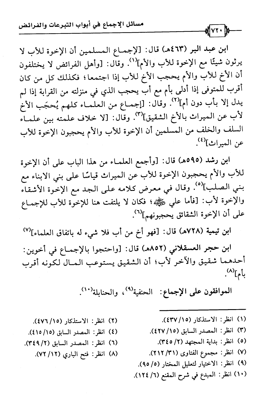 ابن عبد البر (463 هـ) قال: [لإجماع المسلمين أن الإخوة للأب لا يرثون شيئًا مع الإخوة للأب والأم] (¬1). وقال: [وأهل الفرائض لا يختلفون أن الأخ للأب والأم يحجب الأخ للأب إذا اجتمعا؛ فكذلك كل من كان أقرب للمتوفى إذا أدلى بأم مع أب يحجب الذي في منزلته من القرابة إذا لم يدل إلا بأب دون أم] (¬2). وقال: [إجماع من العلماء كلهم يُحجَب الأخ لأب عن الميراث بالأخ الشقيق] (¬3). وقال: [لا خلاف علمته بين علماء السلف والخلف من المسلمين أن الإخوة للأب والأم يحجبون الإخوة للأب عن الميراث] (¬4).