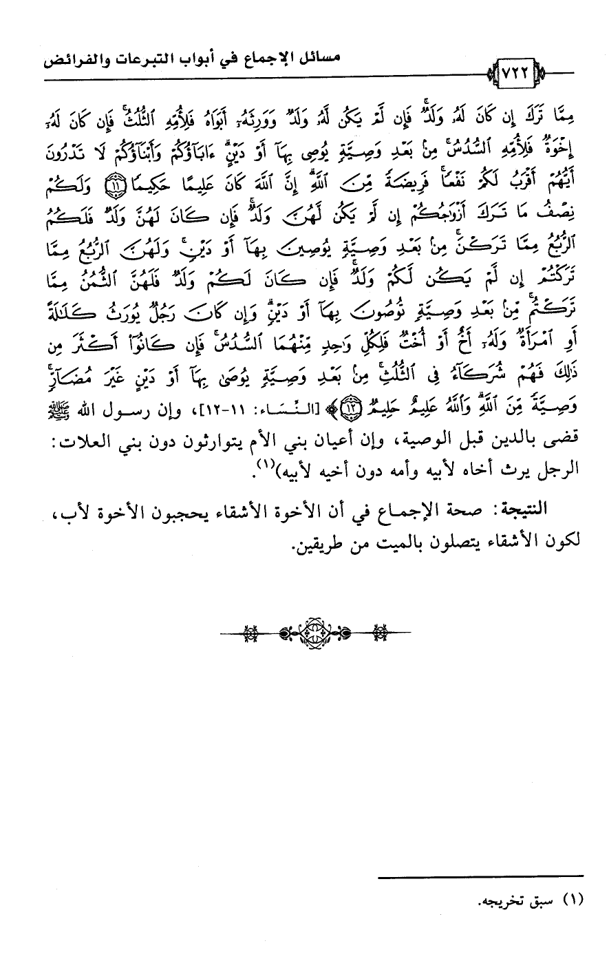 مِمَّا تَرَكَ إِنْ كَانَ لَهُ وَلَدٌ فَإِنْ لَمْ يَكُنْ لَهُ وَلَدٌ وَوَرِثَهُ أَبَوَاهُ فَلِأُمِّهِ الثُّلُثُ فَإِنْ كَانَ لَهُ إِخْوَةٌ فَلِأُمِّهِ السُّدُسُ مِنْ بَعْدِ وَصِيَّةٍ يُوصِي بِهَا أَوْ دَيْنٍ آبَاؤُكُمْ وَأَبْنَاؤُكُمْ لَا تَدْرُونَ أَيُّهُمْ أَقْرَبُ لَكُمْ نَفْعًا فَرِيضَةً مِنَ اللَّهِ إِنَّ اللَّهَ كَانَ عَلِيمًا حَكِيمًا (11) وَلَكُمْ نِصْفُ مَا تَرَكَ أَزْوَاجُكُمْ إِنْ لَمْ يَكُنْ لَهُنَّ وَلَدٌ فَإِنْ كَانَ لَهُنَّ وَلَدٌ فَلَكُمُ الرُّبُعُ مِمَّا تَرَكْنَ مِنْ بَعْدِ وَصِيَّةٍ يُوصِينَ بِهَا أَوْ دَيْنٍ وَلَهُنَّ الرُّبُعُ مِمَّا تَرَكْتُمْ إِنْ لَمْ يَكُنْ لَكُمْ وَلَدٌ فَإِنْ كَانَ لَكُمْ وَلَدٌ فَلَهُنَّ الثُّمُنُ مِمَّا تَرَكْتُمْ مِنْ بَعْدِ وَصِيَّةٍ تُوصُونَ بِهَا أَوْ دَيْنٍ وَإِنْ كَانَ رَجُلٌ يُورَثُ كَلَالَةً أَوِ امْرَأَةٌ وَلَهُ أَخٌ أَوْ أُخْتٌ فَلِكُلِّ وَاحِدٍ مِنْهُمَا السُّدُسُ فَإِنْ كَانُوا أَكْثَرَ مِنْ ذَلِكَ فَهُمْ شُرَكَاءُ فِي الثُّلُثِ مِنْ بَعْدِ وَصِيَّةٍ يُوصَى بِهَا أَوْ دَيْنٍ غَيْرَ مُضَارٍّ وَصِيَّةً مِنَ اللَّهِ وَاللَّهُ عَلِيمٌ حَلِيمٌ (12)} [النساء: 11 - 12]، وإن رسول اللَّه -صلى اللَّه عليه وسلم- قضى بالدين قبل الوصية، وإن أعيان بني الأم يتوارثون دون بني العلات: الرجل يرث أخاه لأبيه وأمه دون أخيه لأبيه) (¬1).Rصحة الإجماع في أن الأخوة الأشقاء يحجبون الأخوة لأب، لكون الأشقاء يتصلون بالميت من طريقين.