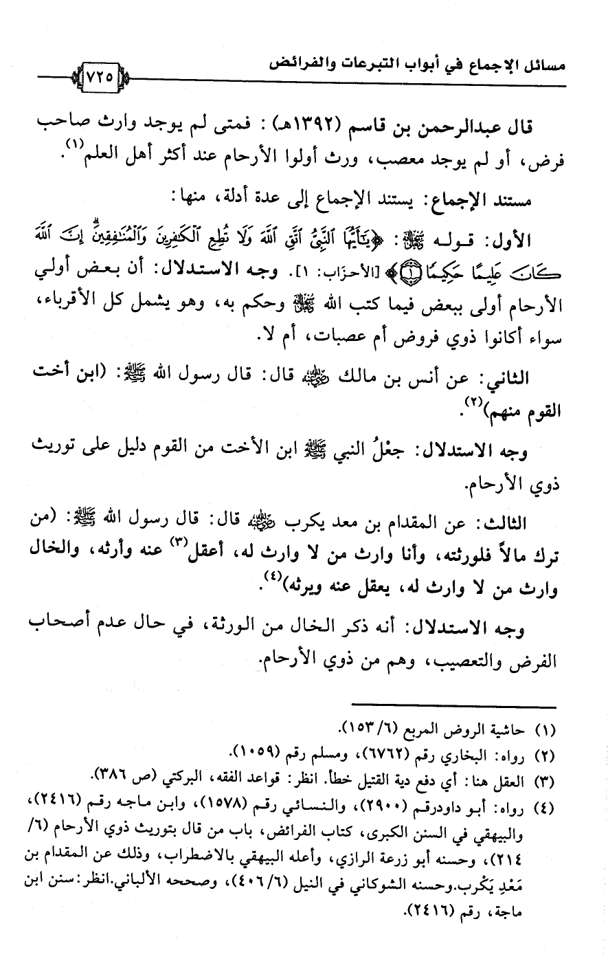 قال عبد الرحمن بن قاسم (1392 هـ): فمتى لم يوجد وارث صاحب فرض، أو لم يوجد معصب، ورث أولوا الأرحام عند أكثر أهل العلم (¬1).