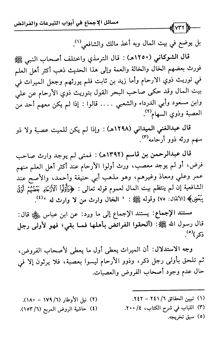 قال عبد الرحمن بن قاسم (1392 هـ): فمتى لم يوجد وارث صاحب فرض، أو لم يوجد معصب، ورث أولوا الأرحام عند أكثر أهل العلم منهم عمر وعلي ومعاذ وغيرهم، وهو مذهب أبي حنيفة وأحمد، والأصح عند الشافعية إن لم ينتظم بيت المال لعموم قوله تعالى: {وَأُولُو الْأَرْحَامِ بَعْضُهُمْ أَوْلَى بِبَعْضٍ} [الأنفَال: 75] وقوله -صلى اللَّه عليه وسلم-: "الخال وارث من لا وارث له" (¬4).