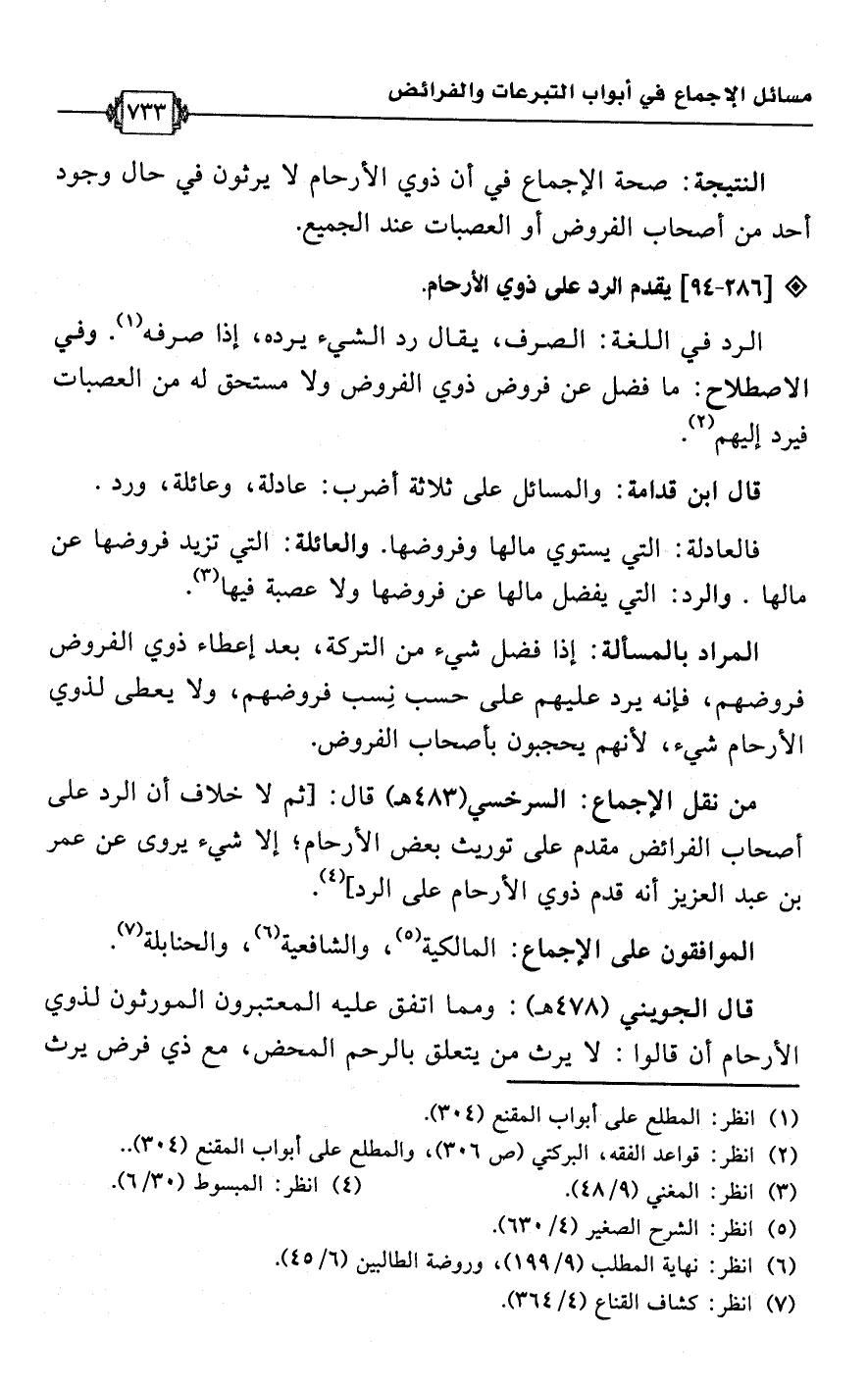 • من نقل الإجماع: السرخسي (483 هـ) قال: [ثم لا خلاف أن الرد على أصحاب الفرائض مقدم على توريث بعض الأرحام؛ إلا شيء يروى عن عمر بن عبد العزيز أنه قدم ذوي الأرحام على الرد] (¬4).