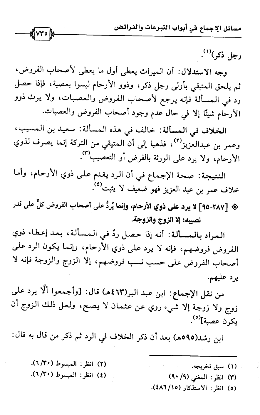 • الخلاف في المسألة: خالف في هذه المسألة: سعيد بن المسيب، وعمر بن عبد العزيز (¬2)، فذهبا إلى أن المتبقي من التركة إنما يصرف لذوي الأرحام، ولا يرد على الورثة بالفرض أو التعصيب (¬3).Rصحة الإجماع في أن الرد يقدم على ذوي الأرحام، وأما خلاف عمر بن عبد العزيز فهو ضعيف لا يثبت (¬4).